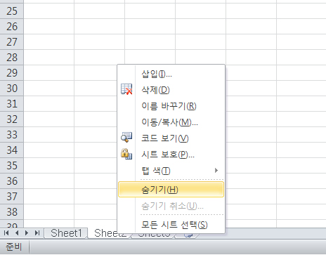 숨기고 싶은 시트를 활성화 한 뒤에 마우스 오른쪽 버튼을 누르면 팝업메뉴가 나오는데 그곳에서 숨기기 메뉴를 클릭하면 해당 시트는 바로 사라지게 됩니다. span>이런 시트 숨기기 기능은 워크시트가 너무 많아서 복잡해서 정리가 안될때 굳이 건들이지 않고 서식 역할만 하는 시트를 숨기거나, 아니면 월별로 뭔가 정리를 하는 서식이 있는데 기간이 지나서 건들일은 없고 나중에 조회할때만 필요할때 불필요한 시트공간 차지하는것을 방지하기 위해서 사용합니다. 허나 가끔 외부의 서식을 받아서 수정해서 쓰려고 하면 수식에 해당하는 시트가 안보여서 애먹으신분들도 좀 계실거에요. 그럴땐 엑셀 시트 숨기기 취소 기능을 이용하면 되는데 굉장히 방법이 간단하니 한번 볼게요.