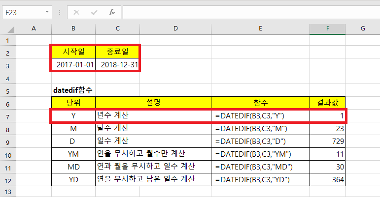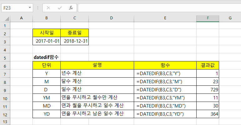 "단위"는 연, 월, 일에 해당하는 "Y, M, D, YM, MD, YD" 등을 지정합니다. 단위를 입력하실때는 "쌍따옴표"를 꼭 해주셔야 합니다.