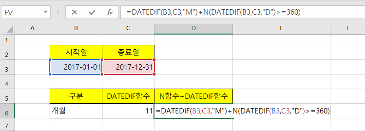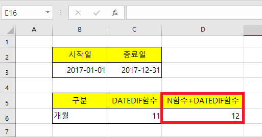 DATEDIF 함수를 사용하여 개월수를 구해보면 표에서와 같이 11개월로 인식하게 됩니다.