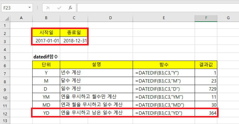 함수는 =DATEDIF(B3,C3,"YD"). 결과값은 364입니다.