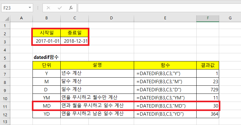 함수는 =DATEDIF(B3,C3,"MD"). 결과값은 30입니다.