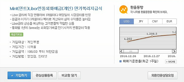 가입기간은 1개월 이상 ~ 6개월 이하 입니다. 가입금액은 100달러 부터 제한없이 가입할 수 있는데 가입시 영업점 방문 또는 인터넷으로 신청이 가능합니다