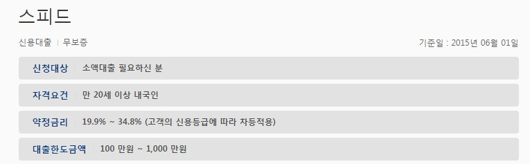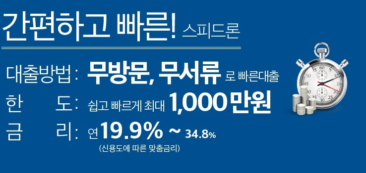 스피드론은 만 20세 이상이시면 누구다 대출 신청이 가능하구요, 대출한도는 100만원 ~ 500만원 까지 입니다. 금리는 19.9 % ~ 23.9 % 인데요, 금리는 본인 신용등급에 따라 달라질 수 있다고 하네요 : )