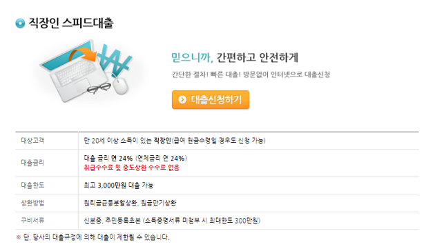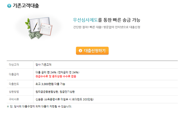 소득증명서류 미첨부 시 최대한도가 300만원 까지 밖에 대출이 안됩니다 ! 대출금리가 조금 비싸다고 저는 생각하는데요, 금리가 연 24%이고, 연체금리도 연 24%로 책정되고 있습니다.