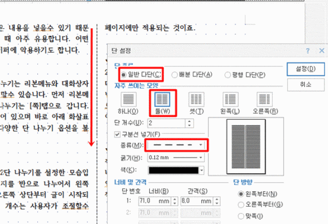한 페이지를 2개의 면으로 나누고 왼쪽부터 본문의 내용을 채운 다음 이어서 오른쪽 면을 채우는 형식입니다. 그리고 구분선 넣기는 예시된 종류 중에서 선택하면 됩니다.