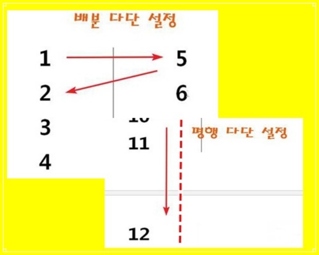 기본 형태로서 가장 많이 쓰이는 일반 다단은 왼쪽 면을 먼저 다 채운 다음에 오른쪽으로 넘어가서 채우는 형식으로 해당 페이지에만 적용되는 방식입니다.