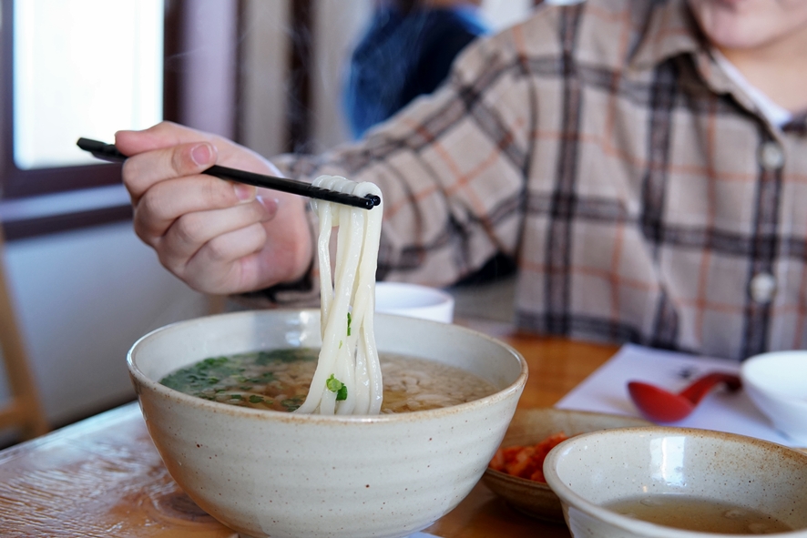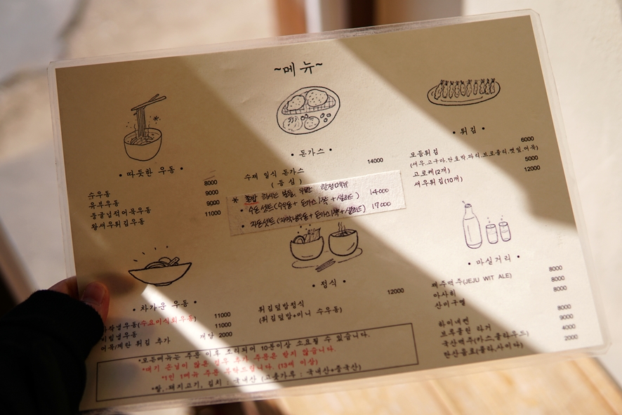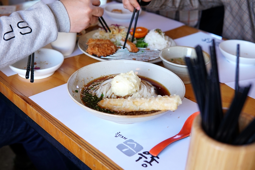 무려 2시간 넘게 기다려서야 음식을 맛볼 수 있었는데, 워낙 유명한 집이라 평일 점심시간이 지났음에도 정말 많은 사람들로 붐볐습니다. 이름을 작성하고, 협재 해수욕장에서 사진 찍고 놀다 보니 어느덧 츄츄네 가족 차례가 되어 메뉴를 주문했는데요. 나혼자산다 수우동은 따뜻한 우동도 유명하지만, 냉우동(수요미식회우동)이 최근에는 더 인기가 좋다고 해서 일식 돈까스와 함께 주문해봤습니다.